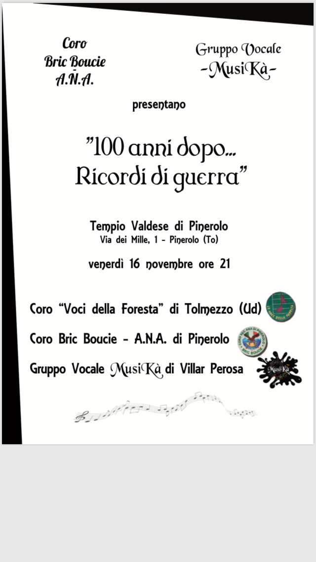 In ordine cronologico partiamo con il concerto di venerdì 16 novembre sul tema “100 anni dopo… ricordi di guerra”. Partecipano il gruppo vocale Musikà, il coro Voci della Foresta di Dolmezzo (Udine) e il coro Bric Boucie gruppo Ana. La colletta raccolta sarà devoluta in beneficenza.