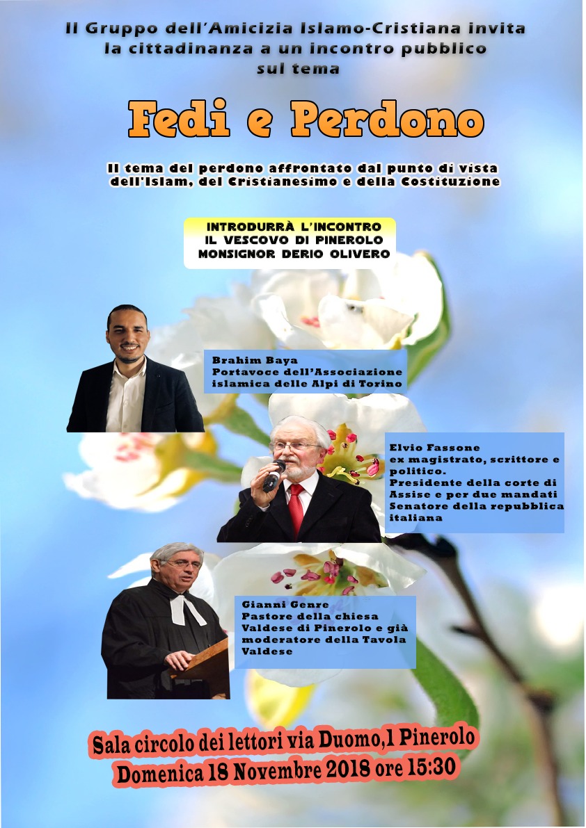 Domenica 18 novembre il gruppo dell’Amicizia islamo-cristiana propone un incontro dal titolo Fedi e perdono, alle ore 15,30, nei locali del Circolo dei lettori di Pinerolo. Si tratta di un confronto sul tema del perdono all’interno del cristianesimo, dell’islam e della società civile. Partecipano il vescovo di Pinerolo, Monsignor Derio Olivero, il pastore Gianni Genre, il portavoce dell’Associazione islamica delle Alpi di Torino, Brahim Baya e il Senatore Elvio Fassone.